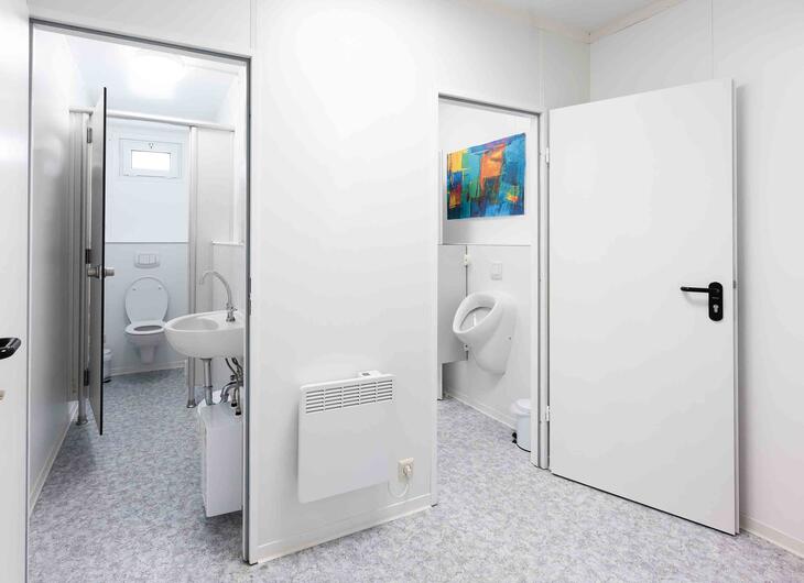 ELA Sanitärcontainer gibt es in unterschiedlichen Ausstattungsvarianten und Größen, darunter auch geschlechtergetrennte Sanitärbereiche.