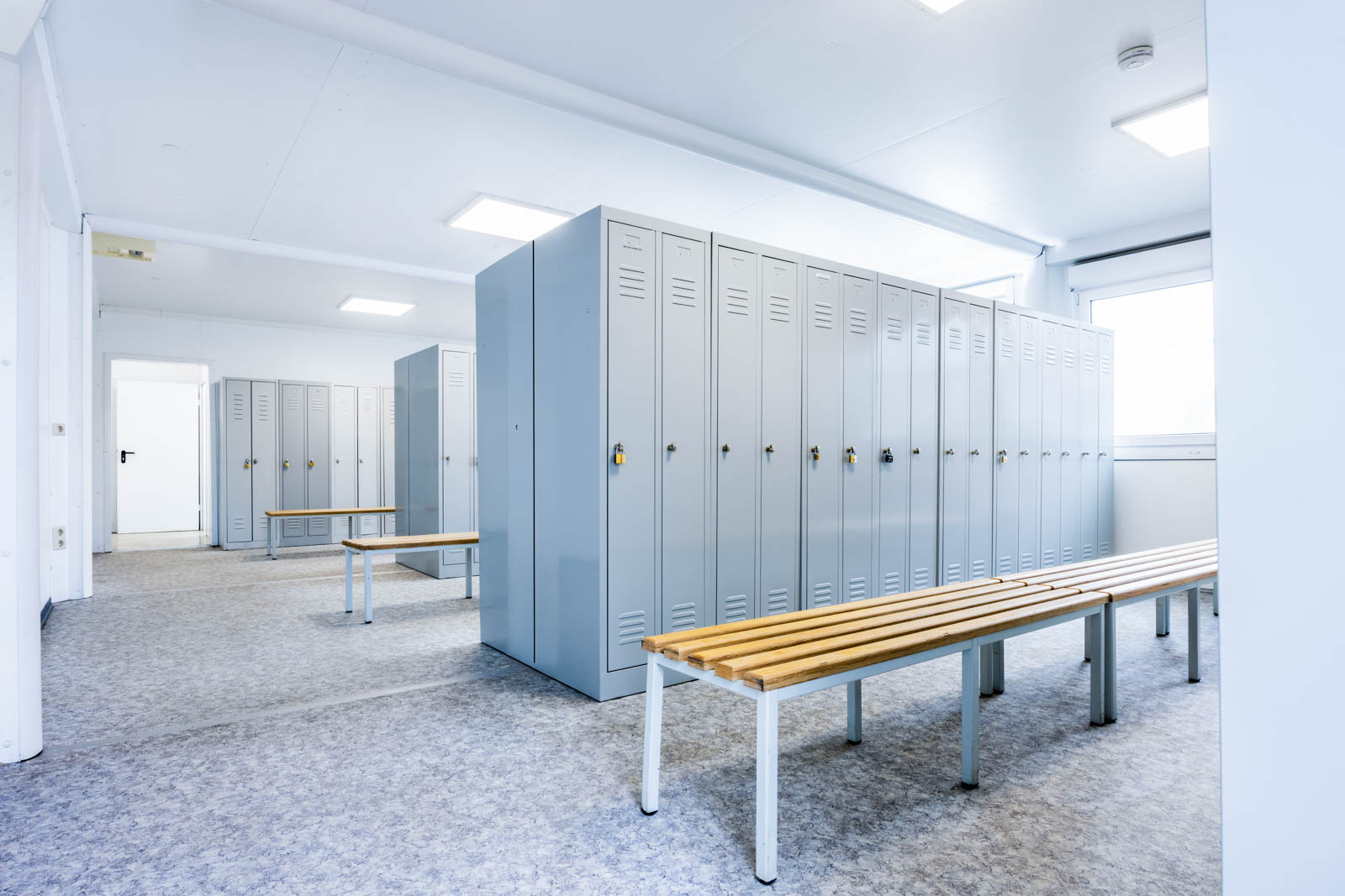 Die temporäre Umkleidelösung von ELA besteht aus zwei Sanitärcontainern und sechs Umkleidecontainern mit einer Nutzfläche von insgesamt 144 Quadratmetern. Die kieselgrauen Container sind mit abschliessbaren Spinden ausgestattet und die Fenster sind mit einer Milchglasfolie versehen, um die Privatsphäre der SAMSON Mitarbeitenden gewährleisten zu können. Zudem unterstreichen die helle Wand- und Deckenfarbe sowie der grau marmorierte Vinyl-Bodenbelag den funktionalen Charakter der Ausstattung und sorgen für eine unkomplizierte Reinigung. Die Umkleideanlage ist für eine einjährige Miete vorgesehen.